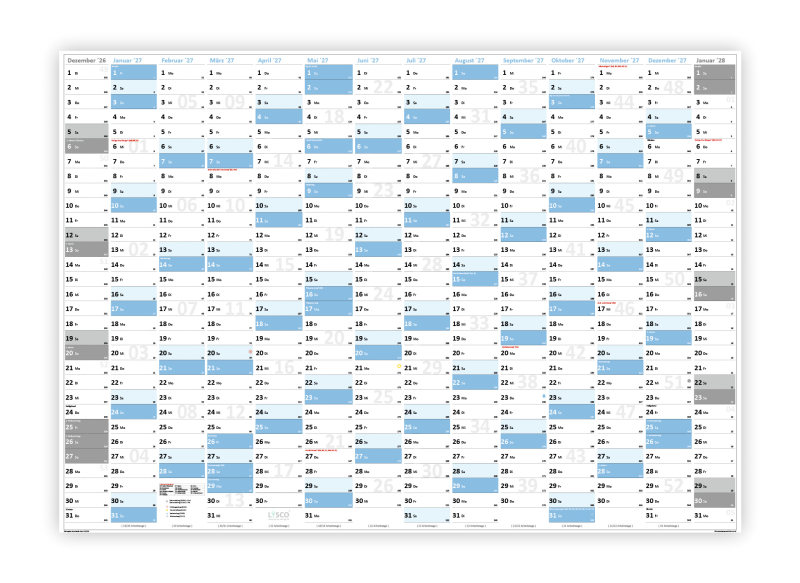 Wandkalender / Wandplaner im großem DIN A0 Format. Gedruckt auf 135 g/m² schwerem und glänzend gestrichenem Bilderdruckpapier.